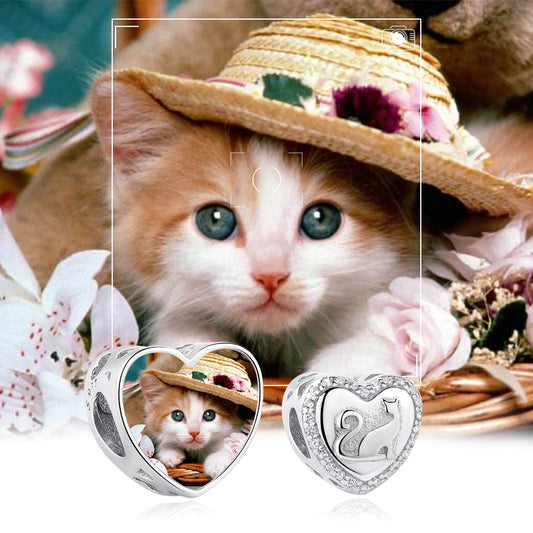 925 Sterling Silver Cute Cat Heart Custom Photo Bead